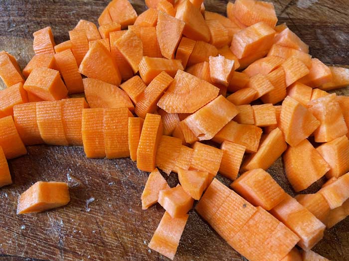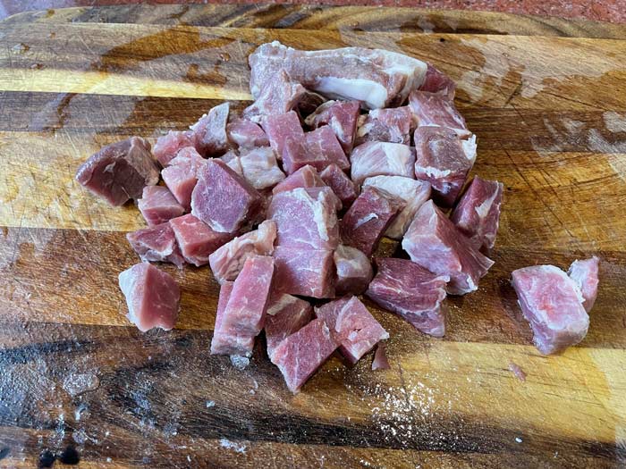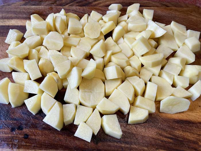 • Пока мясо тушится почистим картофель, помоем его и нарежем кубиками.