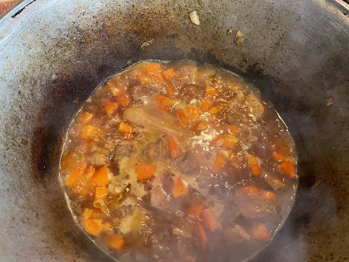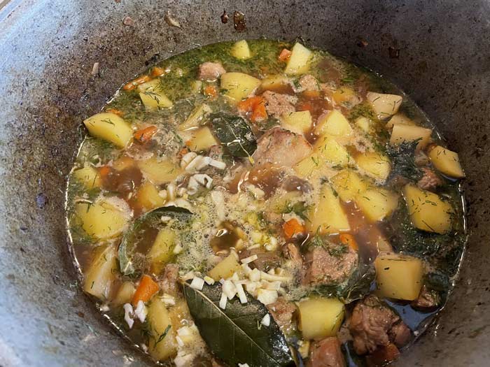 • Перемешаем содержимое казана. Если бульона мало, то добавим горячей воды из чайника, чтоб бульон покрывал картофель и оставляем минут на 15.