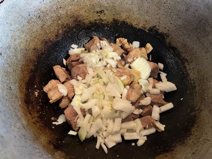 • Ставим на огонь казан , наливаем в него растительное масло и даем ему разогреться.