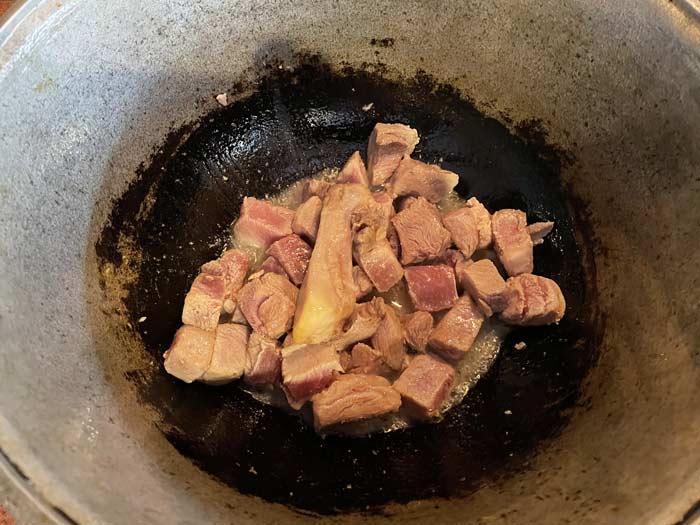 • Мясо потушилось, солим и добавляем в казан картофель.