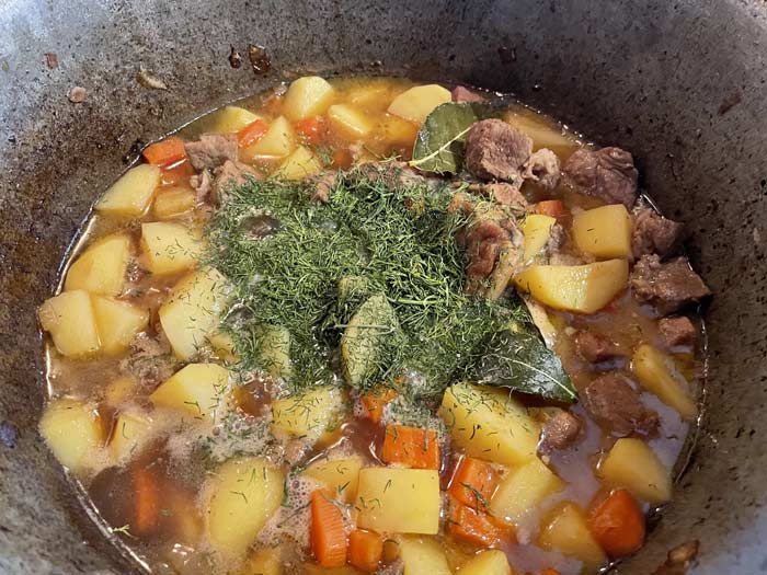 • Высыпаем в казан чеснок и укроп, так как у нас он сухой, чтоб он впитал в себя влагу. Если у вас укроп свежий, им можно просто посыпать уже готовое блюдо.