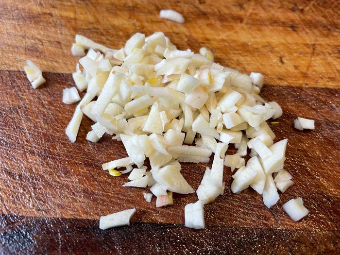 • Пока есть время почистим чеснок, порежем его мелко, или пропускаем через чеснокодавку.