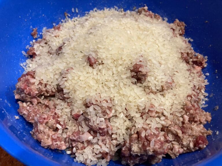 - К получившейся смеси мяса и риса добавляем соль и перец. Окончательно вымешиваем начинку для фарширования перцев. Если начинка получилась суховата, можно добавить в неё полстакана воды. Начинка станет более податливой и ею легче будет начинять перцы.
