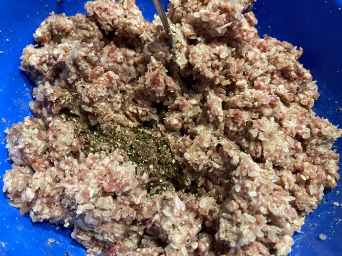 - К получившейся смеси мяса и риса добавляем соль и перец. Окончательно вымешиваем начинку для фарширования перцев. Если начинка получилась суховата, можно добавить в неё полстакана воды. Начинка станет более податливой и ею легче будет начинять перцы.