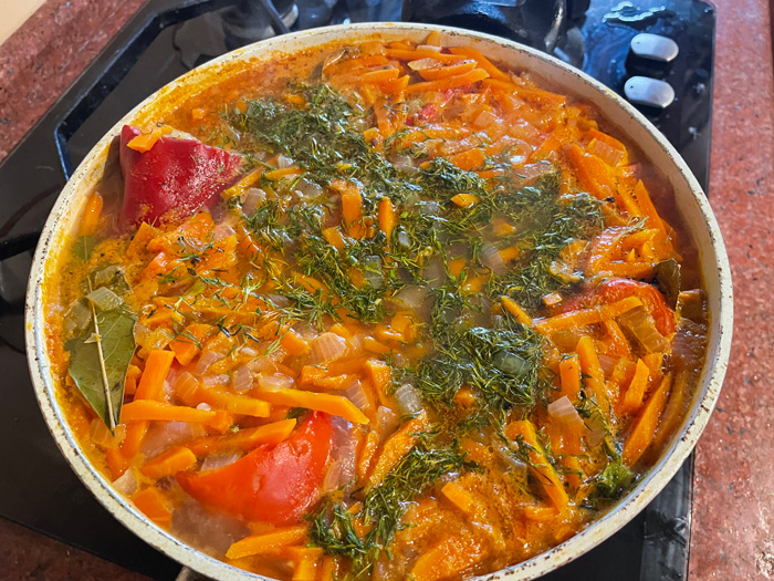 - Высыпаем сверху нарезанный или сушеный укроп. Даем еще пару минут покипеть.