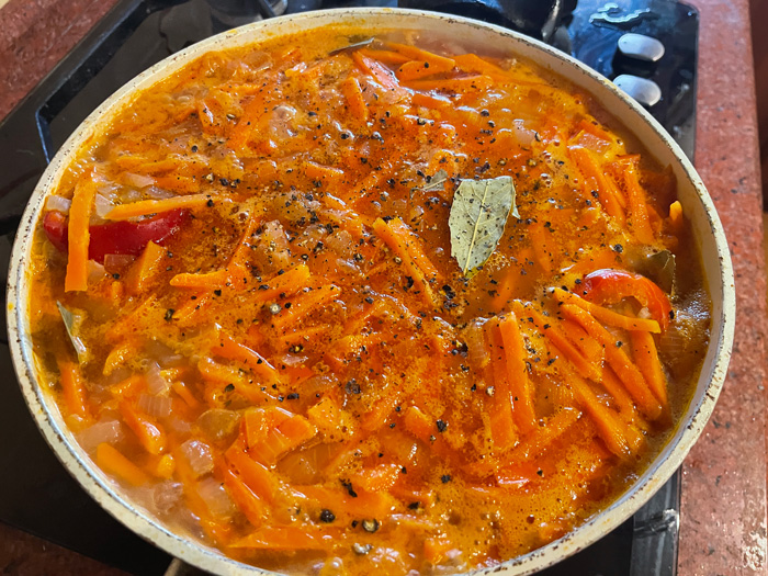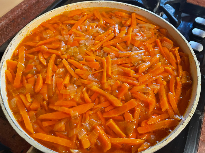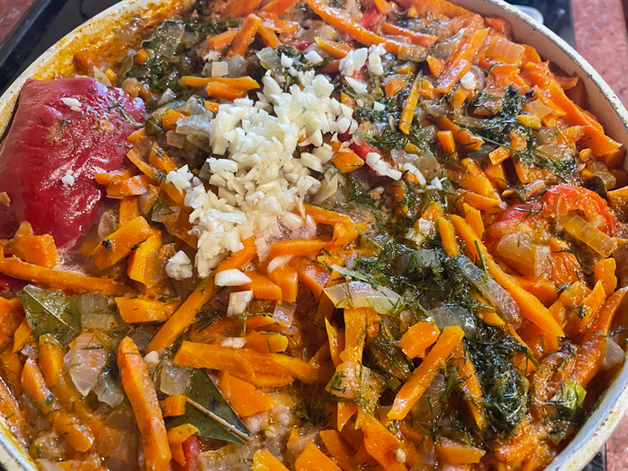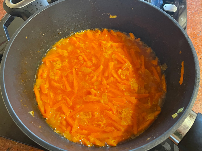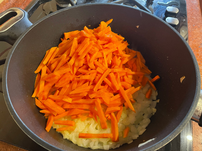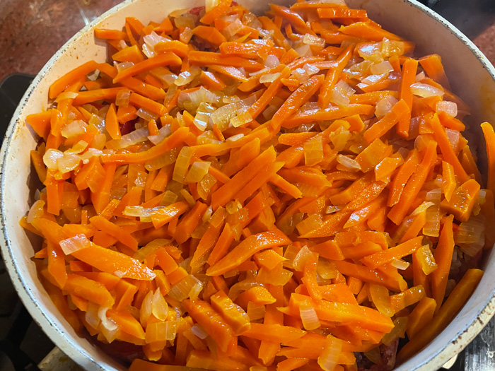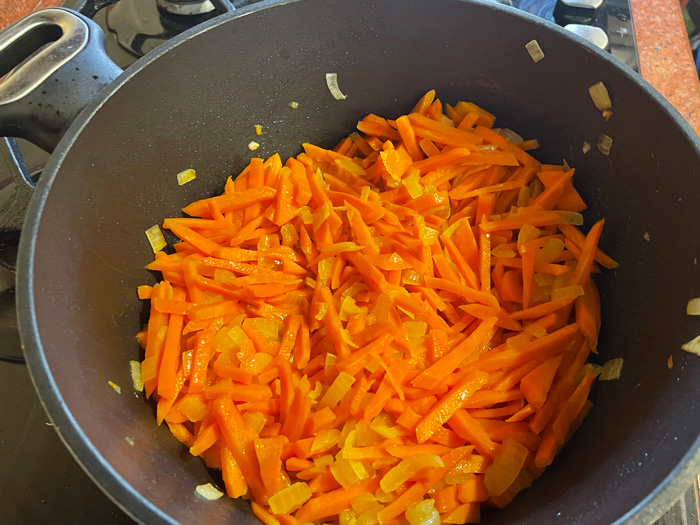 - Перемешаем и дадим моркови обжариться и выпустить аромат.