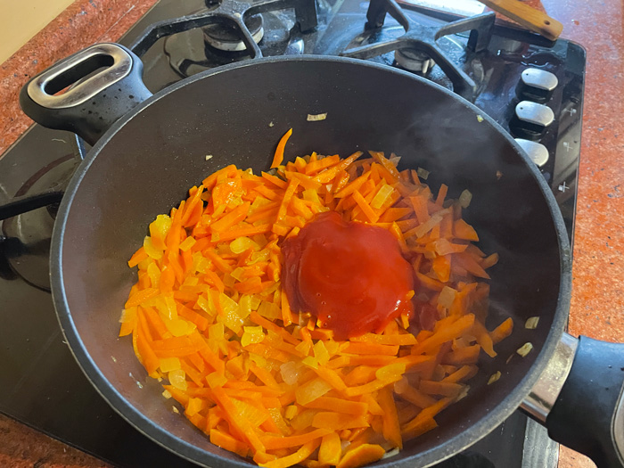 - Добавляем томатную пасту, перемешиваем и обжариваем еще 2-3 минуты.