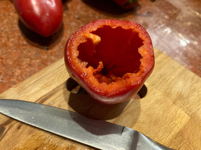 - Начинка готова, займемся перцами. Вымоем их, срежем хвостики и вычистим семечки, сполоснем перчики, и они готовы к фаршировке.