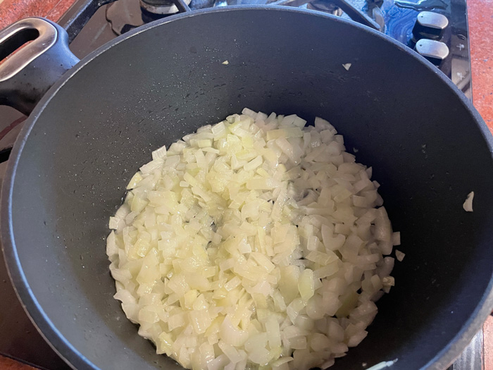 - В разогретое масло добавим нарезанный репчатый лук и обжарим его до золотистого цвета.