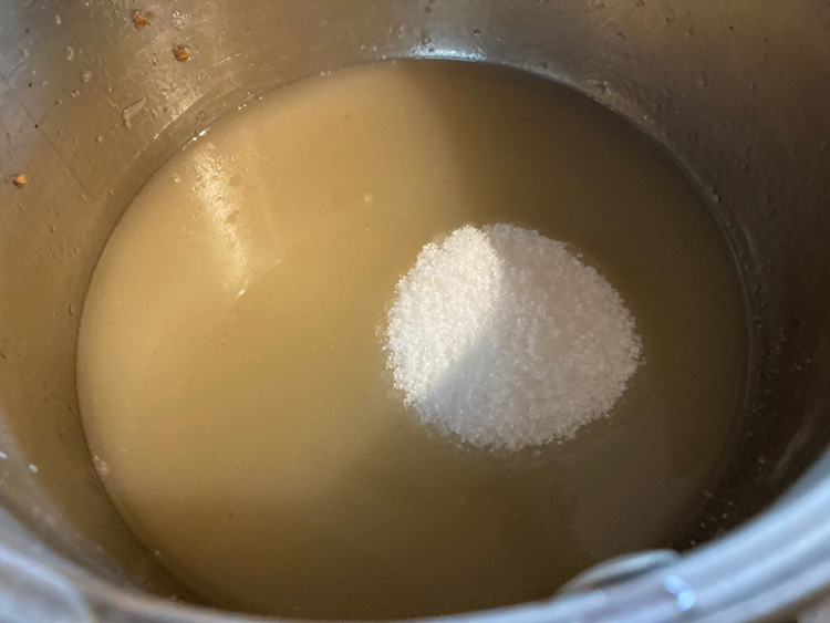 - Получившийся сок возвращаем в кастрюльку, всыпаем в него сахар и доводим до кипения, помешивая, чтоб сахар растворился. Варим не более двух минут. Выключаем огонь и разливаем по подготовленным банкам, закрываем крышками и на хранение. Все готово. Желе получается без использования желатина или агар-агара.