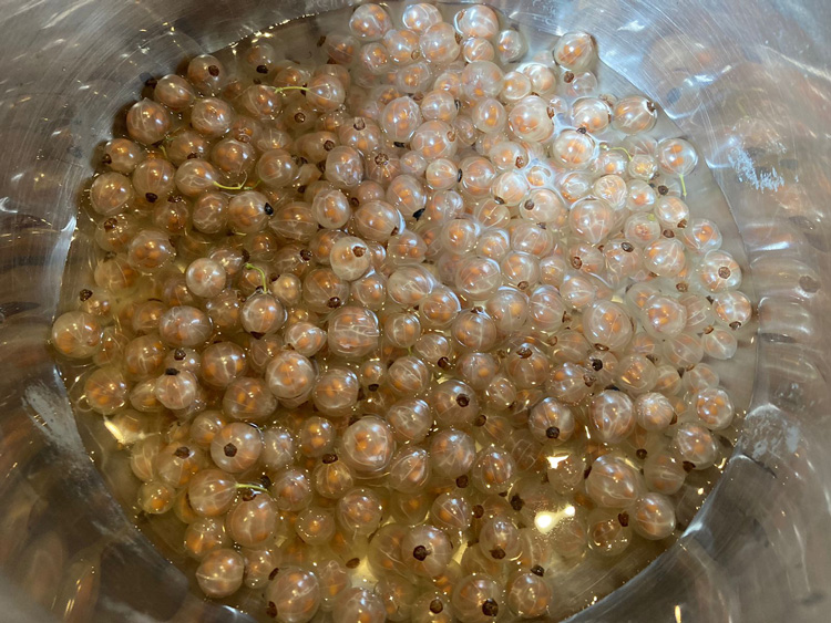 - Для начала нужно подготовить банки и крышки – промыть и простерилизовать. Собранные ягоды промыть под проточной водой, удалить листики и веточки. Всыпать ягоды в кастрюльку, влить воду и на огонь. Чтоб не потерять большую часть полезных свойств белой смородины, долго варить ее нельзя, поэтому доводим до кипения и варим 2 минуты.