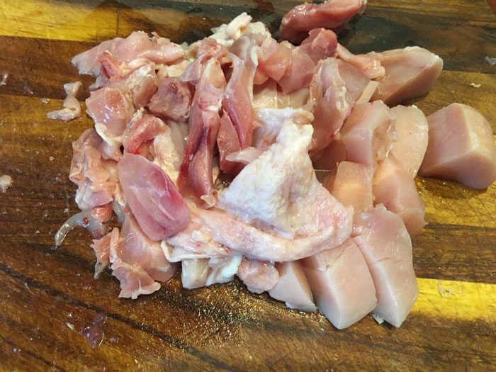 Для начала нужно убрать все кости из курицы. А кожу и мясо нарезаем так, чтоб было удобно пропустить все через мясорубку.