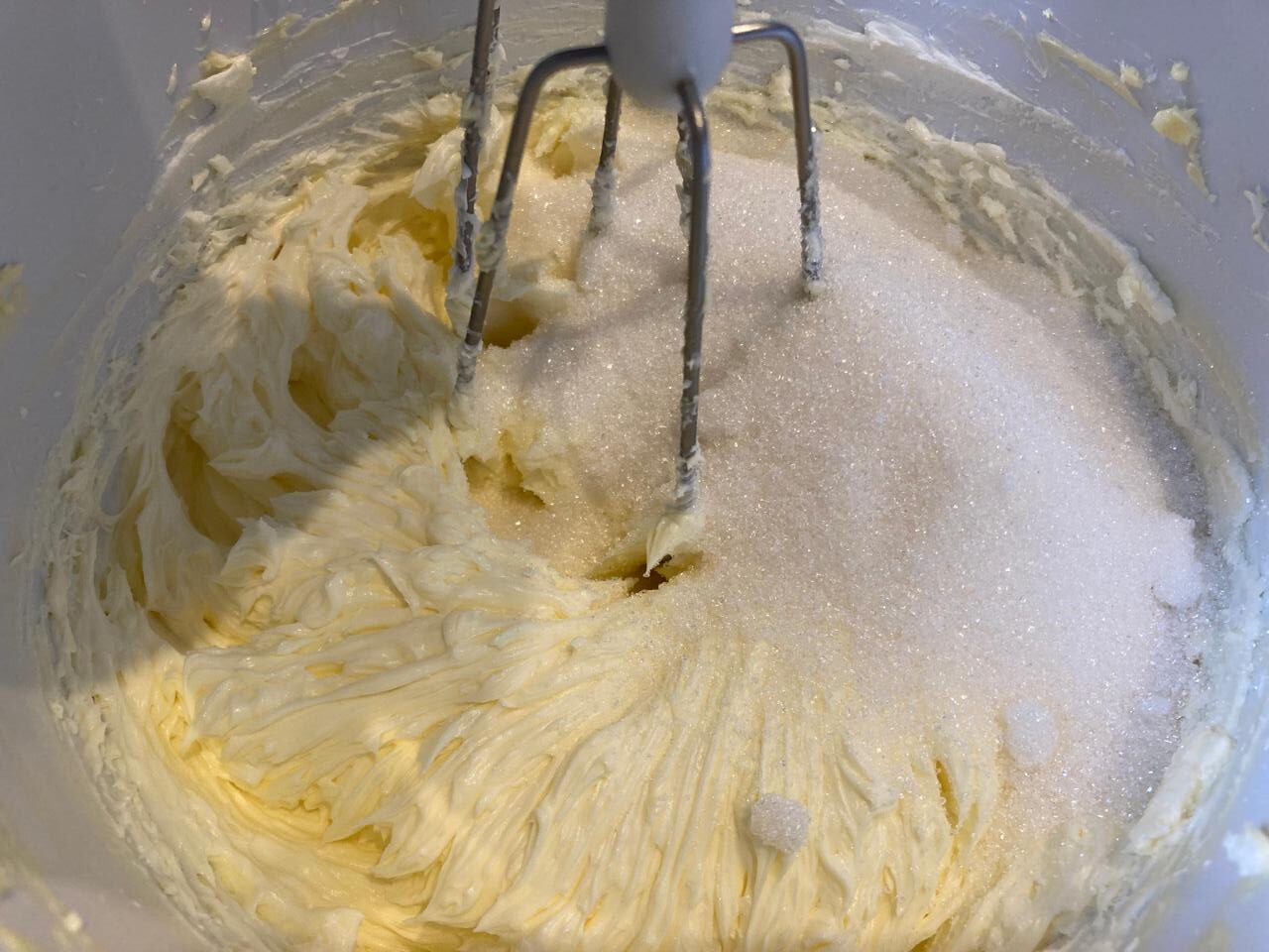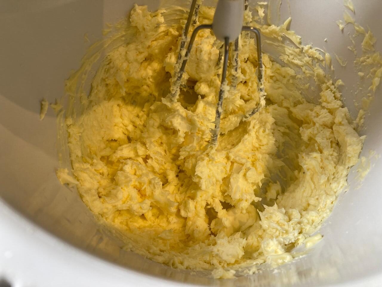 Затем скорость миксера увеличиваем и взбиваем сливочное масло, пока оно не увеличится в объеме и побелеет.
