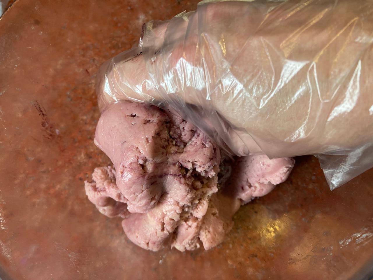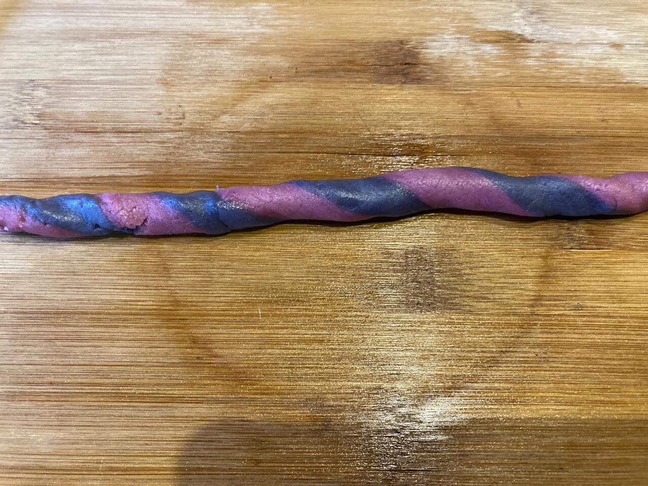 Вымешиваем тесто с красителем до получения ровного цвета, желательно это делать в перчатках, чтоб не отмывать потом руки от краски. Но! Можно оставить и не полное прокрашивание, тогда Ваше печенье получится полосатым, тоже неплохо. Получившиеся части теста раскатываем толщиной 4-5 мм, далее, раскатанные пласты нужно охладить в холодильнике 20 минут, чтоб с тестом было проще работать.