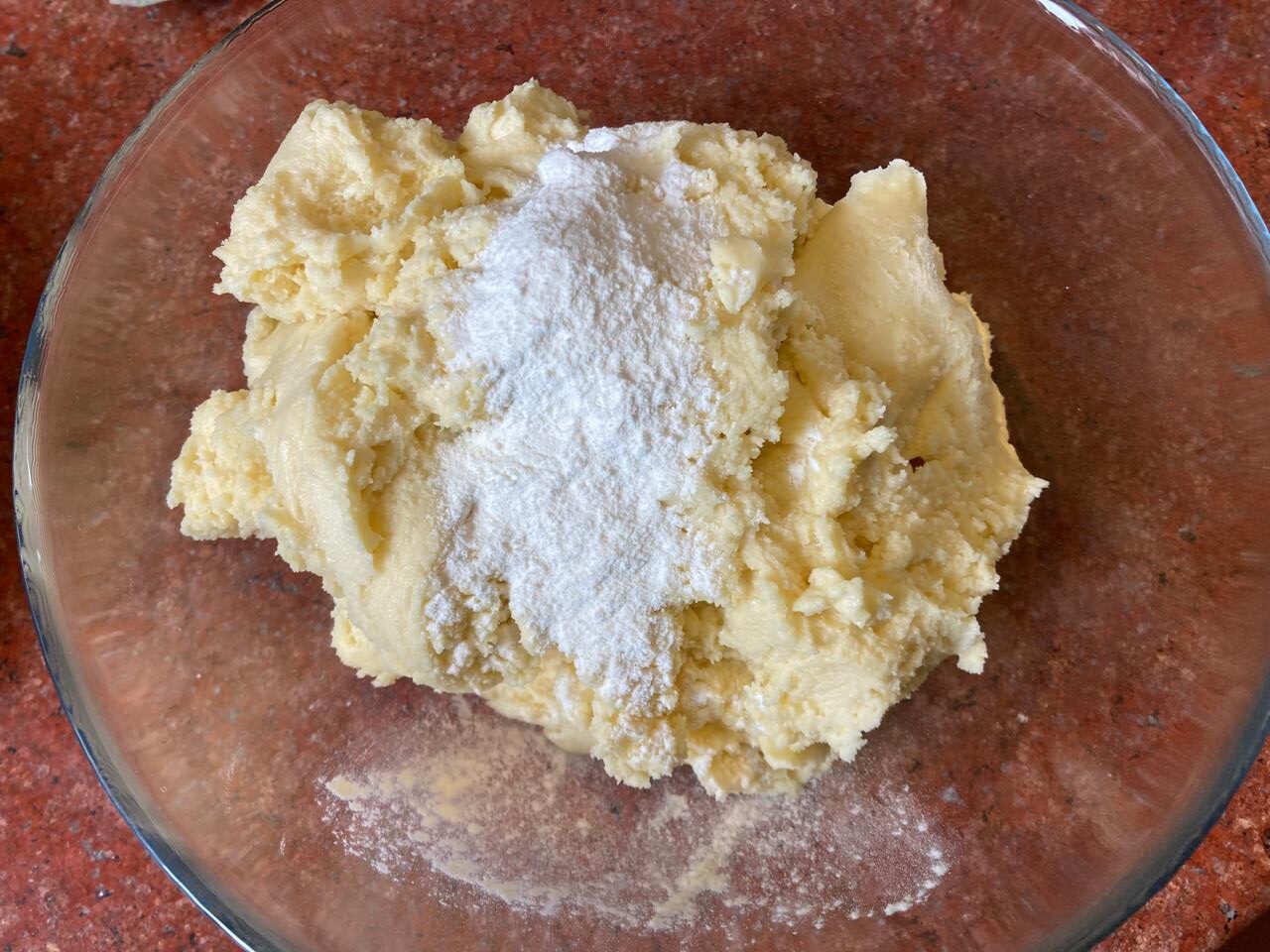 Если Ваш миксер недостаточно мощный, как у меня, то он не справится с вмешиванием всей муки в тесто, поэтому выкладываем тесто в миску, всыпаем в него оставшуюся муку и вмешиваем оставшуюся муку уже вручную.
