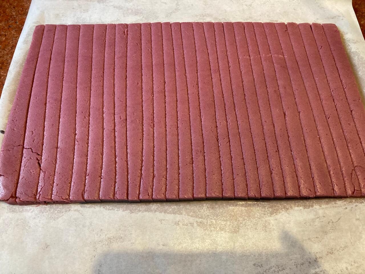 Поскольку у меня запланированы рождественские тросточки, я следую своему плану и нарезаю тесто ножом для пиццы, мне так удобнее, можно и обычным кухонным ножом, на полоски в 1 см.