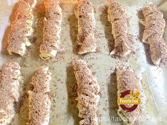 Кисточкой смазываем поверхность прорезанного треугольника из теста яйцом. Яйцо выполняет роль клея для шоколада. Обильно посыпаем натертым шоколадом треугольник из слоёного теста.