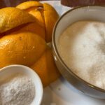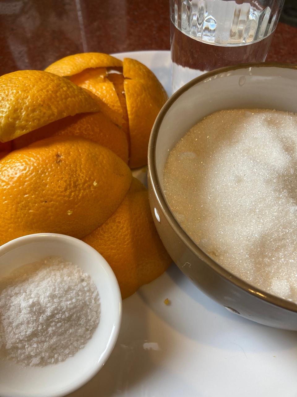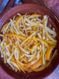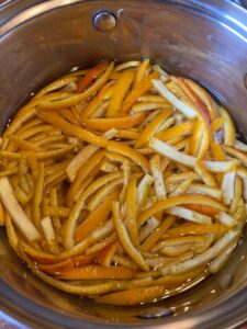 Когда сахар полностью растворился, всыпаем в получившийся сироп подготовленную цедру апельсинов.