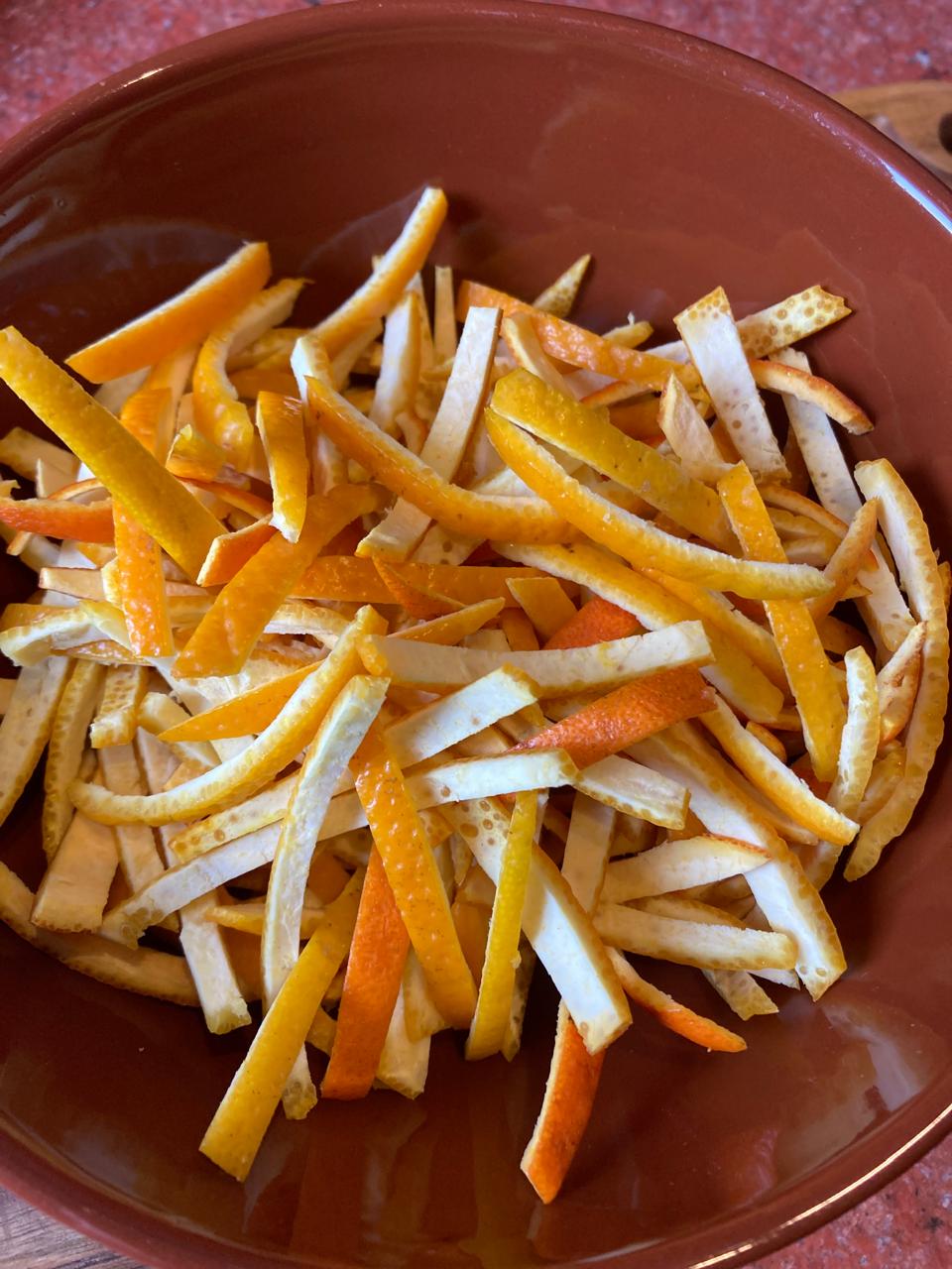 Со шкурок апельсинов снять остатки пленки, нарезать соломкой.