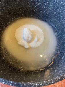 Апельсиновая цедра подготовлена и можно приступать к непосредственному приготовлению цукат. В кастрюльку вливаем 150 мл воды, всыпаем в воду 300 г сахара. Ставим кастрюльку на огонь и готовим сироп, периодически помешивая.