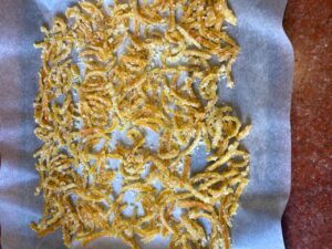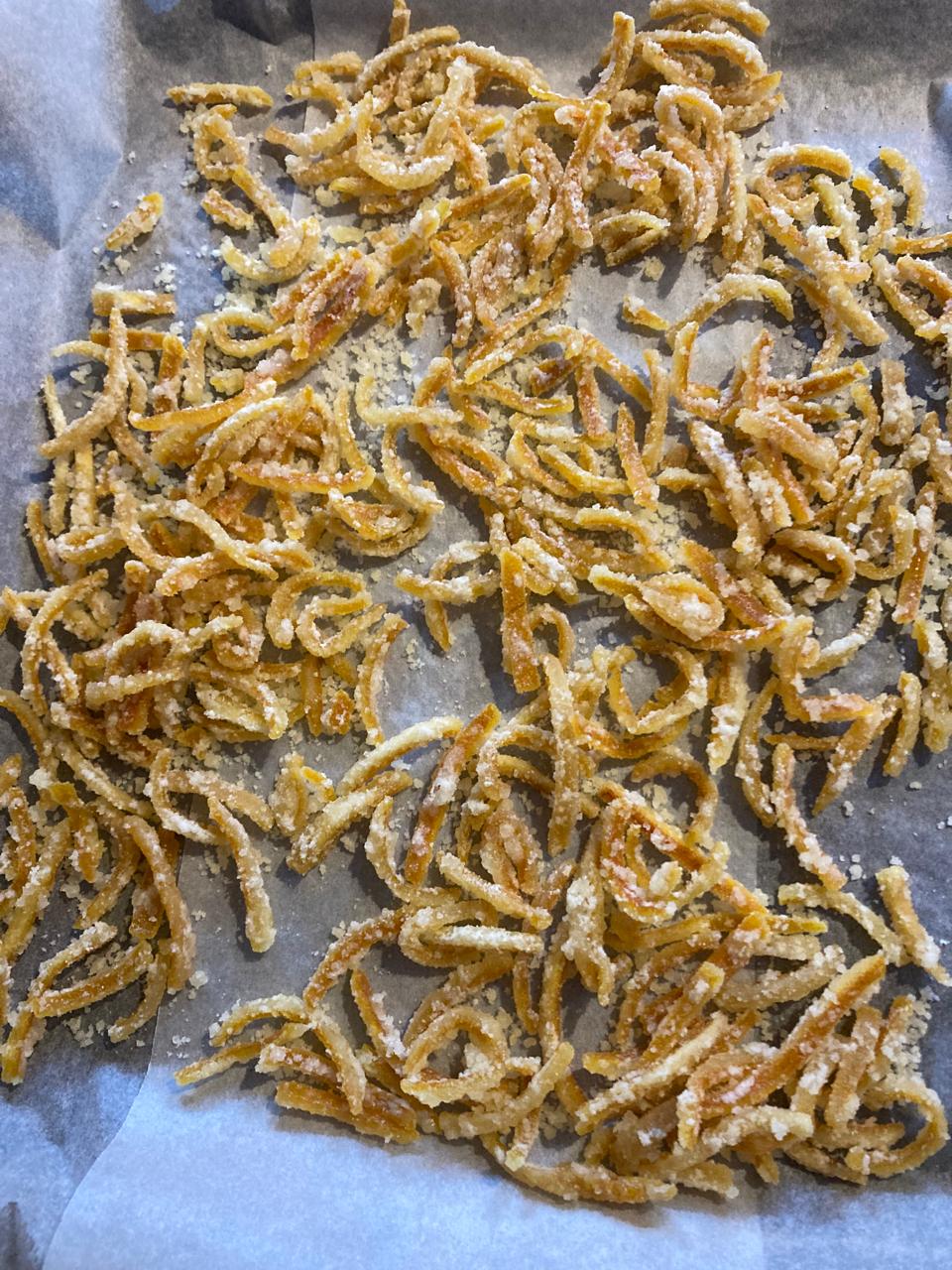 Как только вся жидкость выпарилась, выключаем огонь. Застилаем противень пергаментом, высыпаем на пергамент получившиеся цукаты, равномерно распределяем их по противню и ставим их в духовку для подсушивания на 30 минут, при температуре 70 градусов.