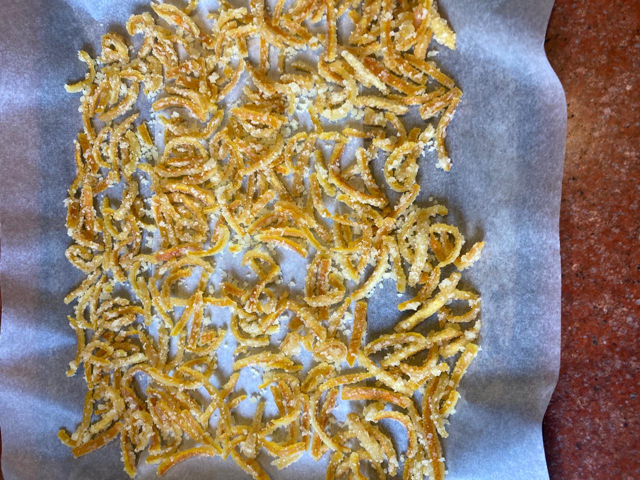 Вывариваем на слабом огне до полного впитывания сиропа цедрой апельсина, периодически помешивая, особенно под конец вываривания. Чтоб не подгорел сахар.